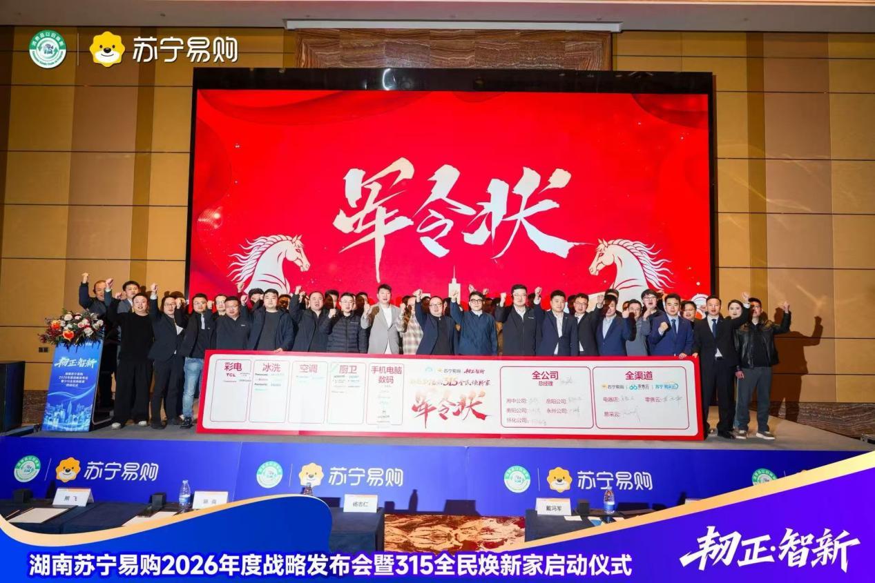3月10日下午,湖南苏宁易购2026年度供应商大会暨“315全民焕新家”启动仪式在长沙隆重召开。苏宁易购集团南部战区总裁戴冯军、湖南大区总经理陈爽出席活动。湖南省新零售行业协会代表,以及来自海尔、海信、美的、方太、博西等各大知名家电品牌的供应商总经理,中国电信、银联及多家主流媒体代表齐聚一堂,共同开启苏宁易购“315全民焕新家”品质消费盛典。